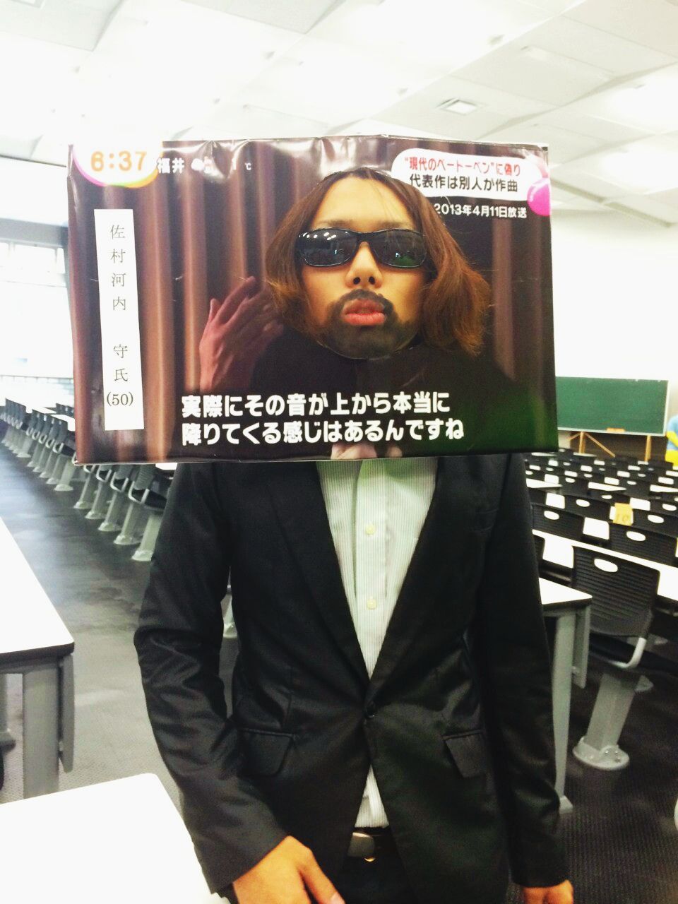 顔写真の代わりに、去年のハロウィンパーティの佐村河内氏のコスプレ画像を貼ります。髪の長さや顔のパーツから、顔を覚えていただければと思います。