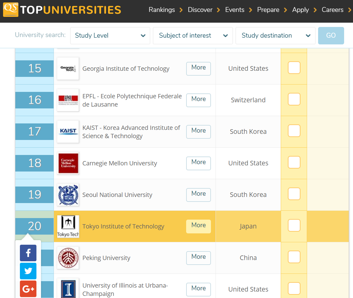 Tokyo Institute of Technology is 20th ranked in QS World University Rankings 2018 Engineering - Electrical & Electronic.