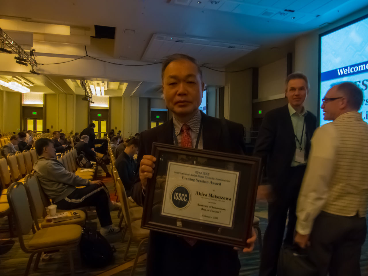 博士研究員のDengさんがサンフランシスコで開催中のISSCC(3年連続)で、自動配置配線可能なPLLについて発表をしました。大変盛況でした。500名ぐらい?聴講でしょうか。Dengさんはこの2月から米国Appleで働いており、現地からの参加でした。AppleがあるCupertinoから車で1時間だそうです。 Wei Deng, et al.,“A 0.048-mm2 3-mW Synthesizable Fractional-N PLL with a Soft Injection-Locking Technique“従来の自動配置配線可能なPLLは整数倍(20,21,22,..等)の逓倍比のみだったのですが、世界で初めて分数周波数倍(20.112, 20.113,…等)を実現しました。Soft Injectionというテクニックで実現しています。